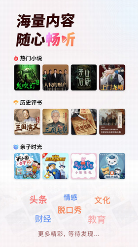 蜻蜓FM收音机海量内容随声随享是一款专注语音互动与音频服务的多场景应用,覆盖儿童成长、知识拓展、休闲娱乐等多元需求。从经典名著到实时资讯,从亲子故事到财经解读,通过智能终端实现声音内容的无缝衔接,让不同年龄层用户都能找到属于自己的听觉盛宴。