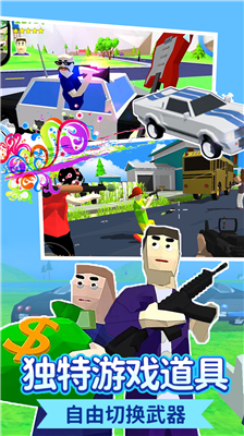 1、多元化装备系统囊括传统枪械与创意道具,从彩虹发射器到香蕉手雷,每种武器都配有专属特效