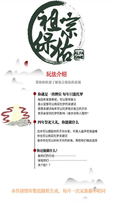 《祖宗保佑家族传承策略手游》是由国内独立团队打造的文字模拟经营游戏。玩家将化身古代宗族先祖,自秦朝起始守护血脉延续,通过制定祖训、调整族人特质等策略,引领家族跨越千年历史洪流。游戏创新采用托梦干预机制,先祖可消耗香火对后代进行指引,但儿孙是否遵从则会触发不同命运轨迹。