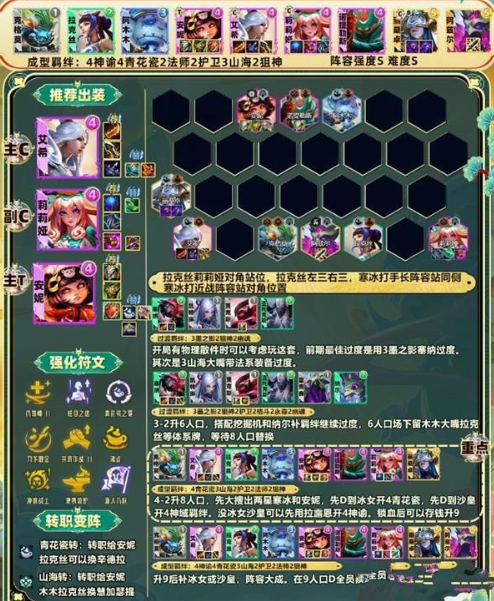 本套阵容需升至9人口完全成型,核心羁绊由4神谕者提供群体回蓝加成,搭配4青花瓷提升团队攻速。3山海绘卷强化前排坦度,2法师与2狙神则分别增强法术爆发与物理输出能力。具体构成如下: