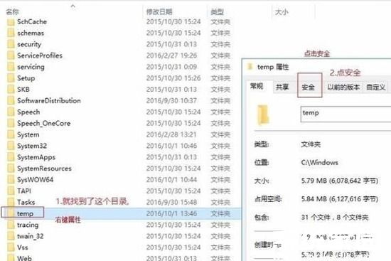 4、进入C盘Windows系统目录找到Temp文件夹,右键菜单选择属性设置