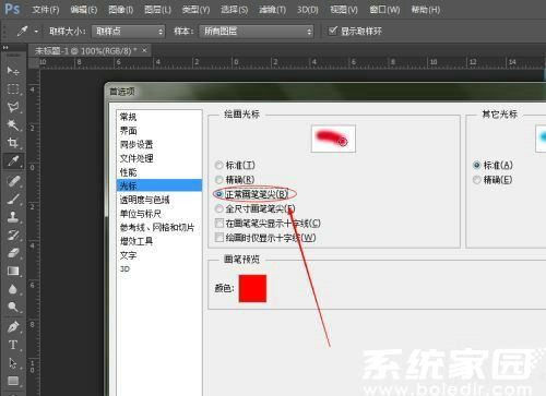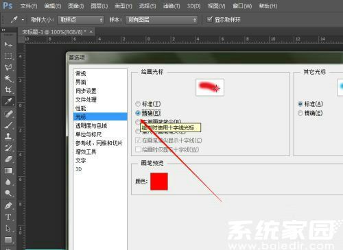2. 在绘画光标选项组中,可见「标准」「精确」「正常画笔笔尖」三种模式。检查当前是否勾选「精确」模式