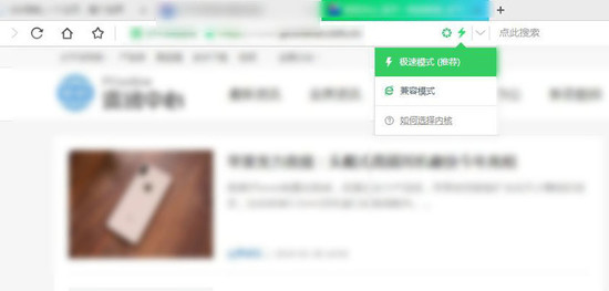步骤2、访问目标网站后,注意地址栏末端内核标识。当前显示闪电符号表示处于极速模式,点击图标展开菜单,选择带有IE图标的兼容模式选项即可完成即时切换;