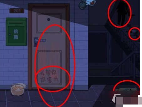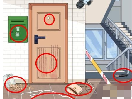 初始场景包含七个核心交互点:金属信箱表面存在明显凹陷、断成两截的武士刀斜插地面、敞开的皮质挎包散落文件、倾倒的馄饨汤汁形成特殊图案、防盗门三道平行划痕、石灰地面勾勒的白色轮廓线以及猫眼内部异常的胶状物质。需注意武士刀断裂面呈现规则切痕,暗示存在专业切割工具介入。