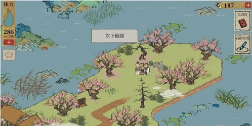 2、在记忆幻境中与文人墨客唐寅展开对话,重点操作区域位于场景左侧的古桃树旁。使用先前获取的「桃韵凝露」激活枯枝,通过三次浇灌操作使整株桃树重现繁盛花海,至此完整解锁该篇章剧情内容。