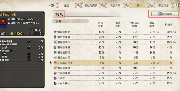 针对钢龙的狩猎行动中,猎人可通过多个途径获取古龙的大宝玉:任务完成时3%概率获得目标报酬,成功破坏头部可获得3%概率的额外奖励。本体剥取与尾部剥取分别有2%和3%的获取机会,战场残留的掉落物亦有1%概率产出该稀有素材。