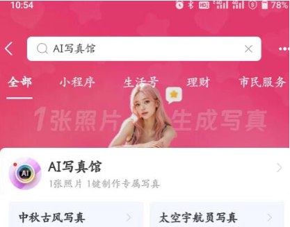 1、启动支付宝客户端,在顶部搜索框输入"AI写真馆"关键词