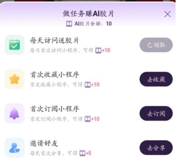 3、通过完成指定任务获取更多胶片:包括邀请好友体验(+5胶片/人)、分享作品至社交平台(+3胶片/次)、连续登录奖励等