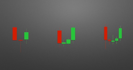 实际交易中常见变形启明星,如图示左侧形态中间出现T字线而非标准十字星。此类变体需结合量能指标验证,若反弹阶段伴随交易量放大,技术信号可信度将显著提升。
